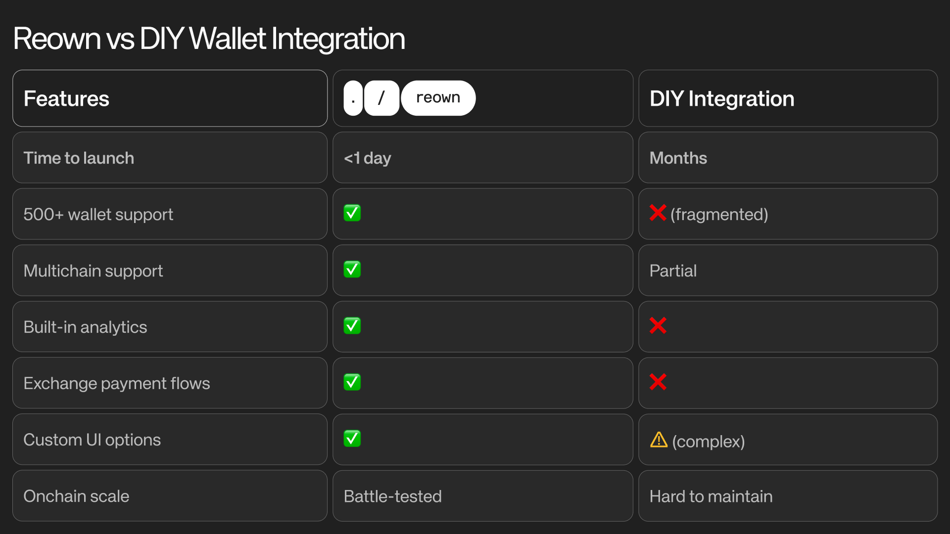 Want to build your own? You can, but it’ll cost you. We’ve seen teams burn weeks of engineering time and thousands in capital just to recreate what Reown does out of the box. With Reown, setup takes minutes, not months. One engineer can ship a fully working wallet flow in an afternoon. In some cases, you won’t even need an engineer. That’s the difference: Reown lets you focus on your product, not infrastructure.