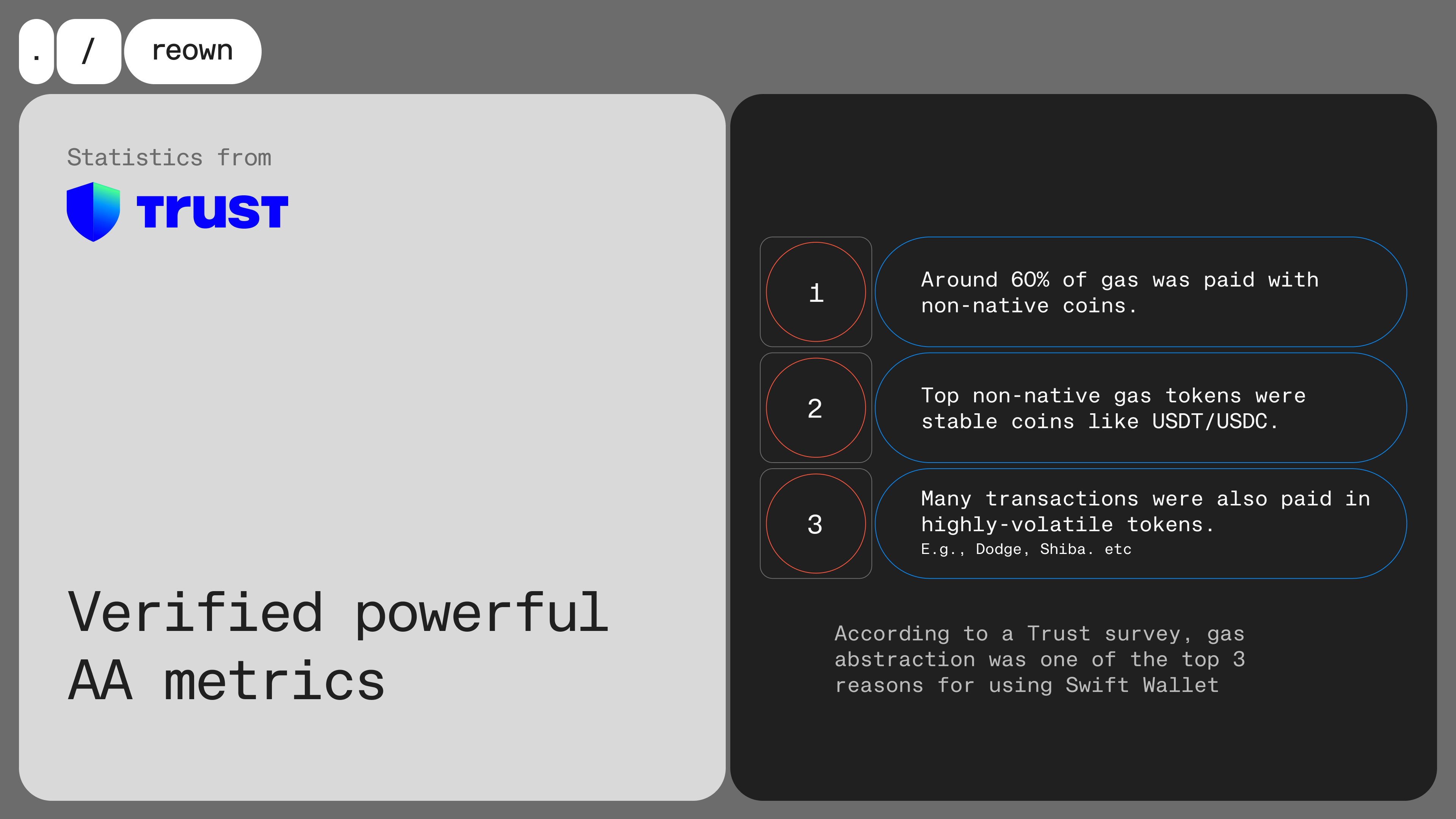 “Our data have verified that Gas Abstraction was a strong incentive to use AA. We have seen that over 60% of transactions in Trust Swift were paid with non-native tokens in some months,” says David Kim, Trust’s AA Wallet Team Lead.