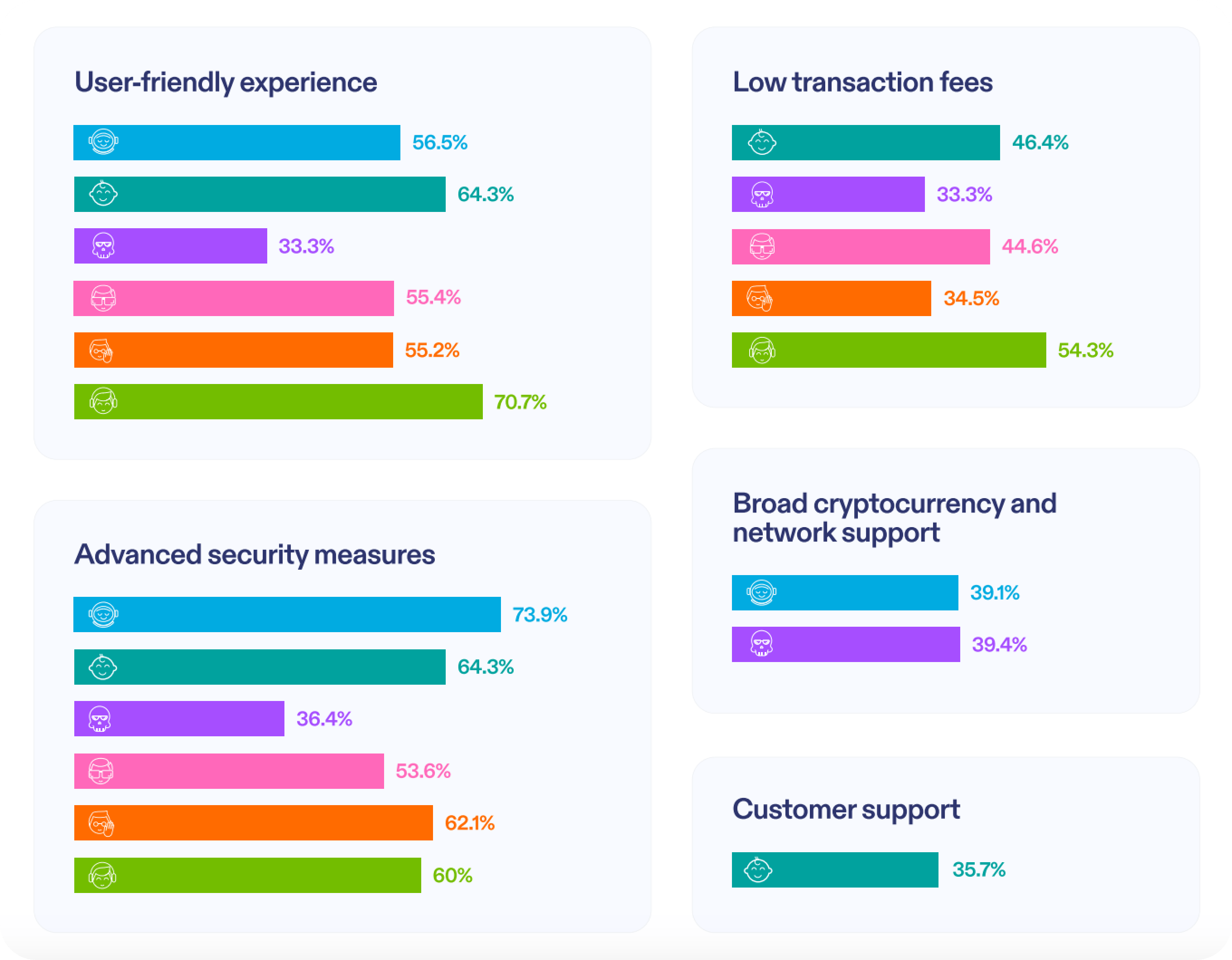 - 50% of respondents expressed strong confidence in using crypto products and services, it comes as no surprise that nearly 40% of newcomers cited security as their primary concern.