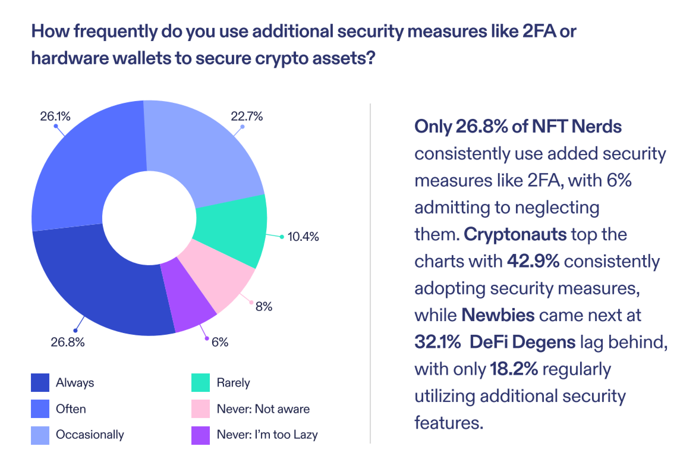 - Despite an expectation for robust security from dapps and wallets, only 27% regularly adopted practical security features, like 2FA, while 6% acknowledged neglecting to add them entirely.