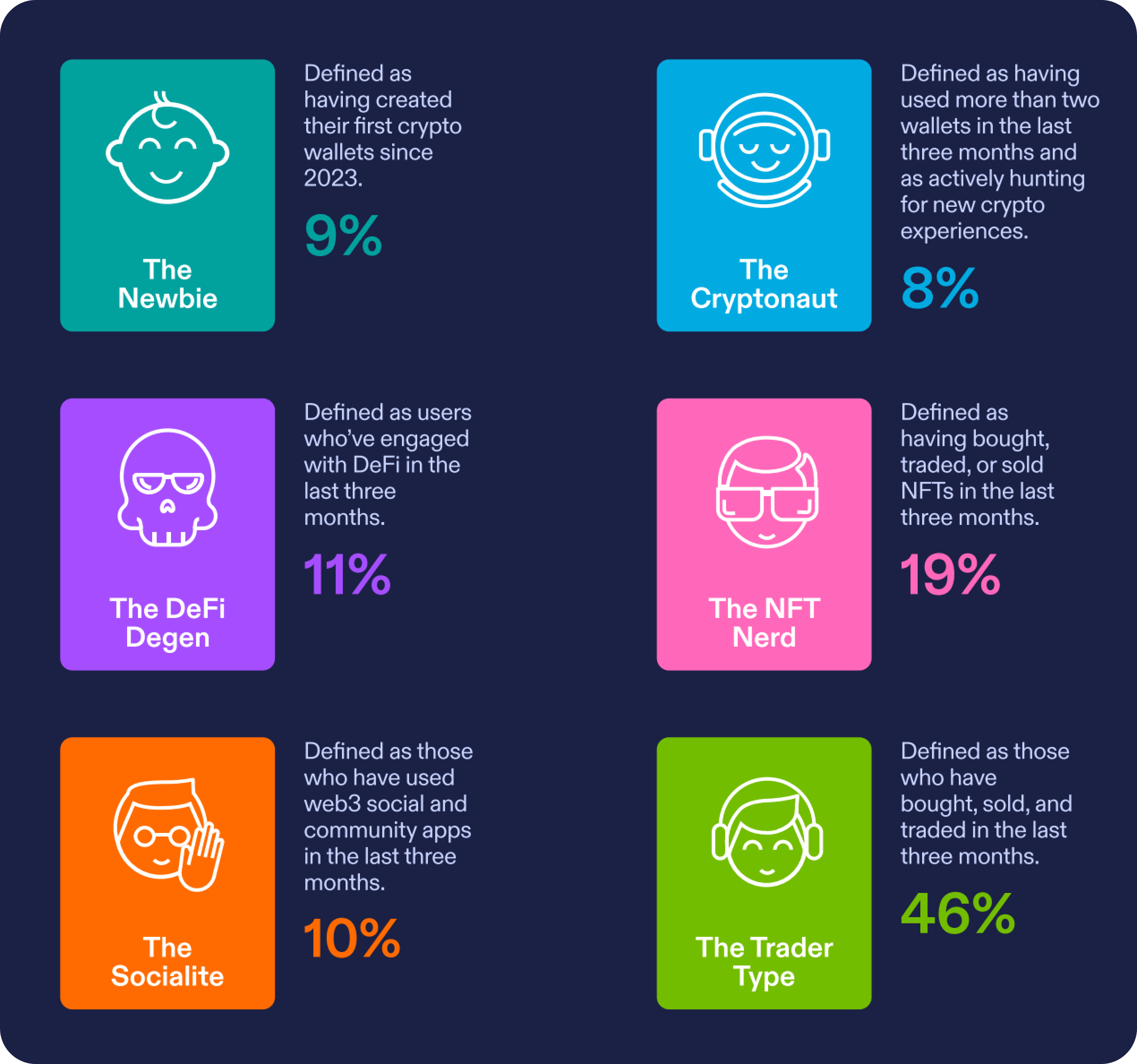 Surveying nearly 300 users, our data reveals a fascinating mosaic of crypto personas – from “Newbies” to “NFT Nerds,” these personas offer a more nuanced understanding of our diverse crypto community. A standout was the emergence of "Socialites," making up 10% of respondents, indicating a growing trend of users engaging with web3 social and community apps. Does this suggest a shift from traditional crypto activities to more community-driven experiences?