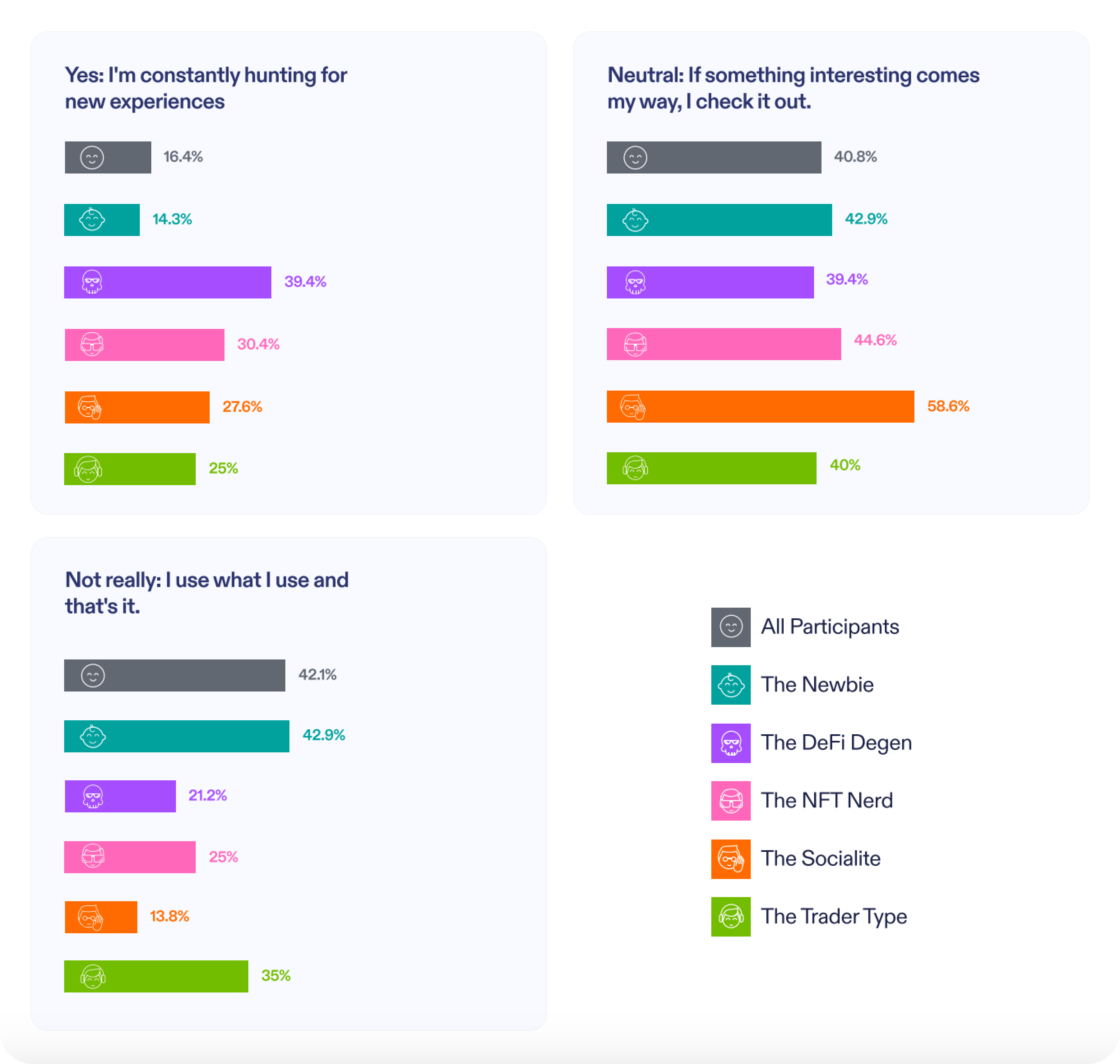 - For dapp creators, the insights get more intriguing with 40% expressing a willingness to embrace new features, and a noteworthy 16% say they actively seek out new web3 experiences.