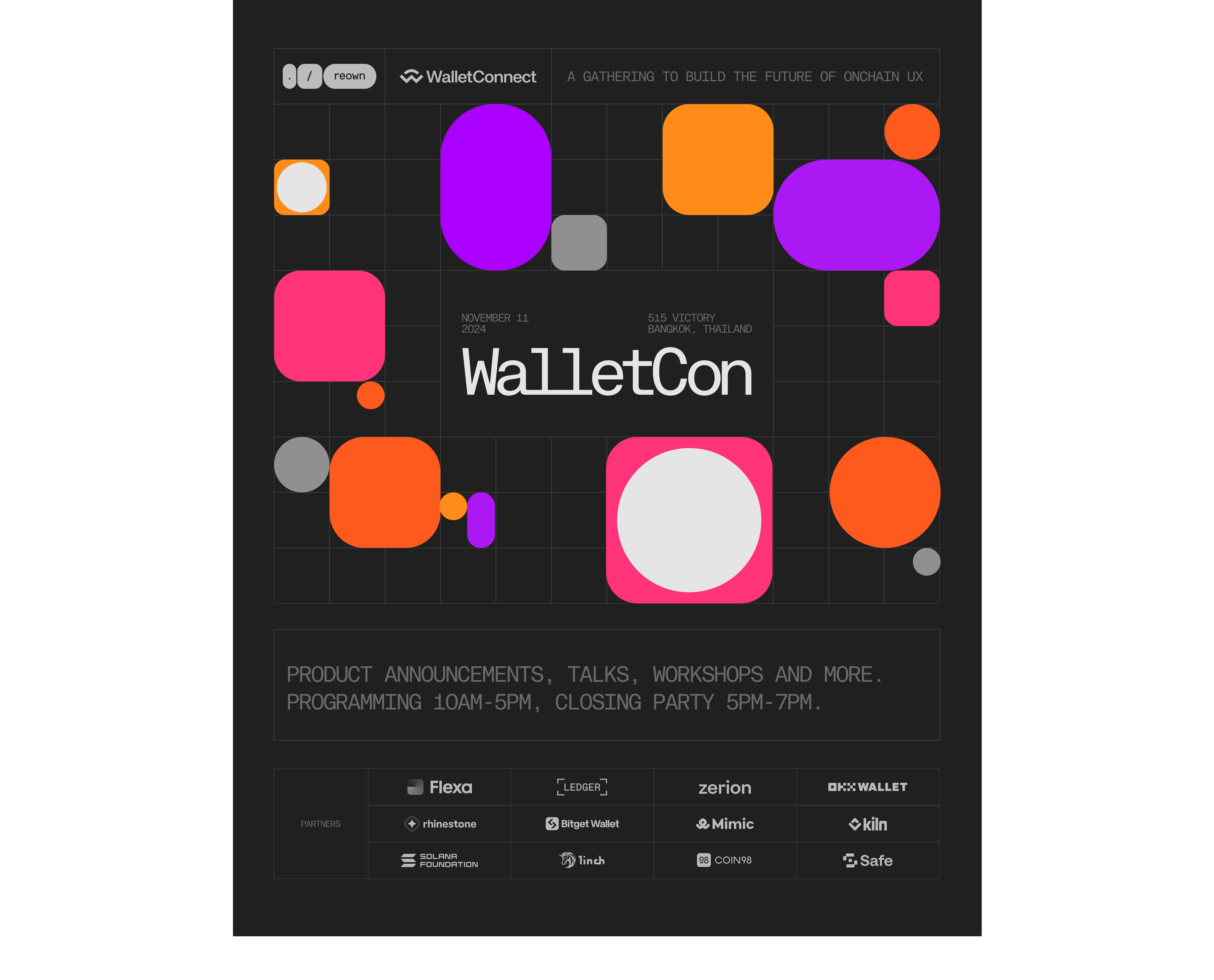 Brought to you by Reown and the WalletConnect Foundation, this year’s WalletCon is proudly backed by partners Flexa, Ledger, Zerion, OKX Wallet, Rhinestone, BitGet Wallet, Mimic, Kiln, Solana Foundation, 1inch, Coin98, and Safe.