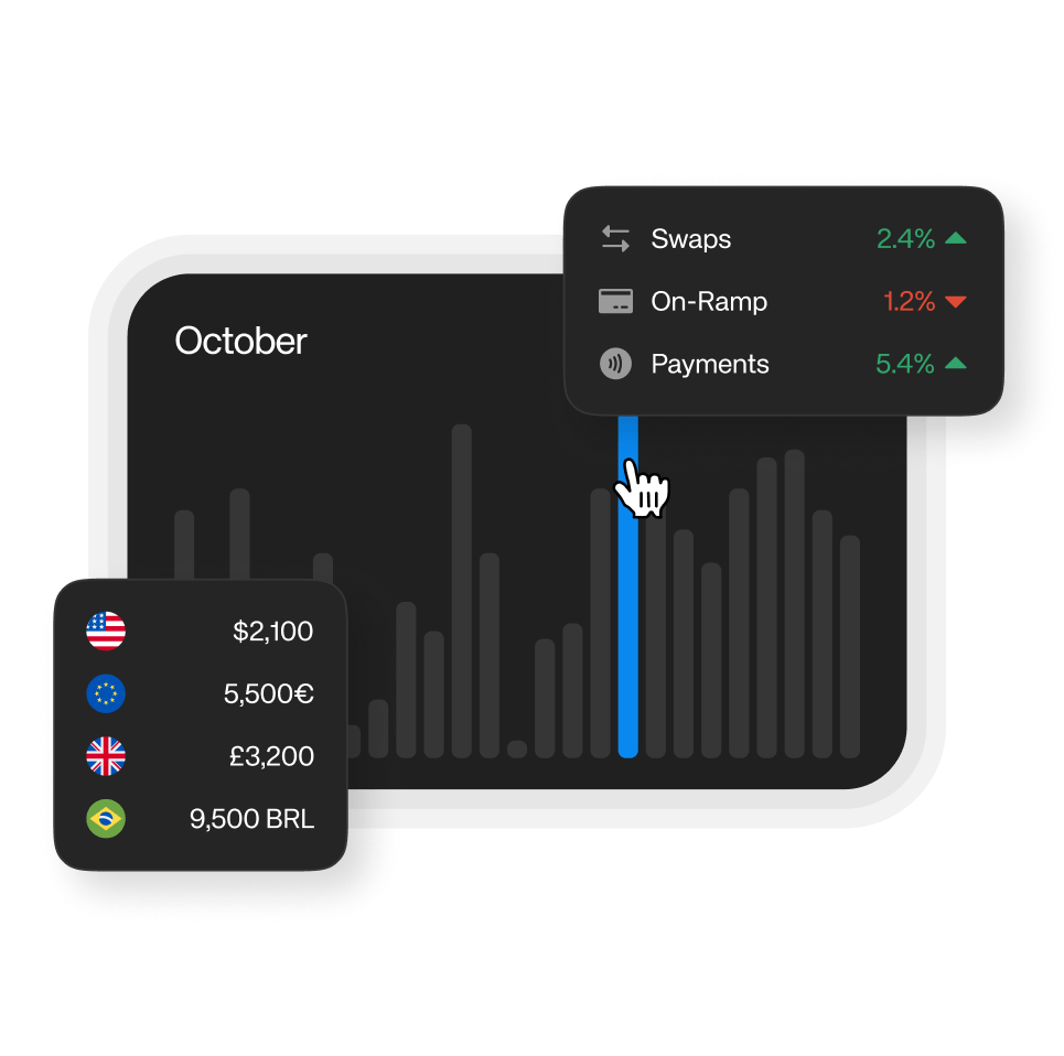 Track swaps, onramps, and payments across chains and currencies. See where value moves and what drives your onchain growth.